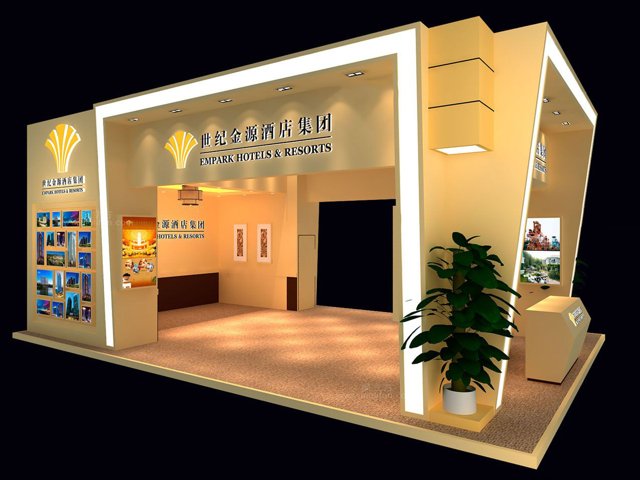 契合世紀(jì)金源的品牌形象和產(chǎn)品特性,采用矩形結(jié)構(gòu),再搭配燈具燈光的效果,襯托出展位大氣、豪華的氛圍,突出一種簡(jiǎn)約、時(shí)尚的品味。