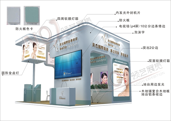 契合貝拉國際的品牌形象和產(chǎn)品特性,采用矩形結(jié)構(gòu),再搭配燈具燈光的效果,襯托出展位時尚、簡約的氛圍,突出一種現(xiàn)代、活力的時尚品味。