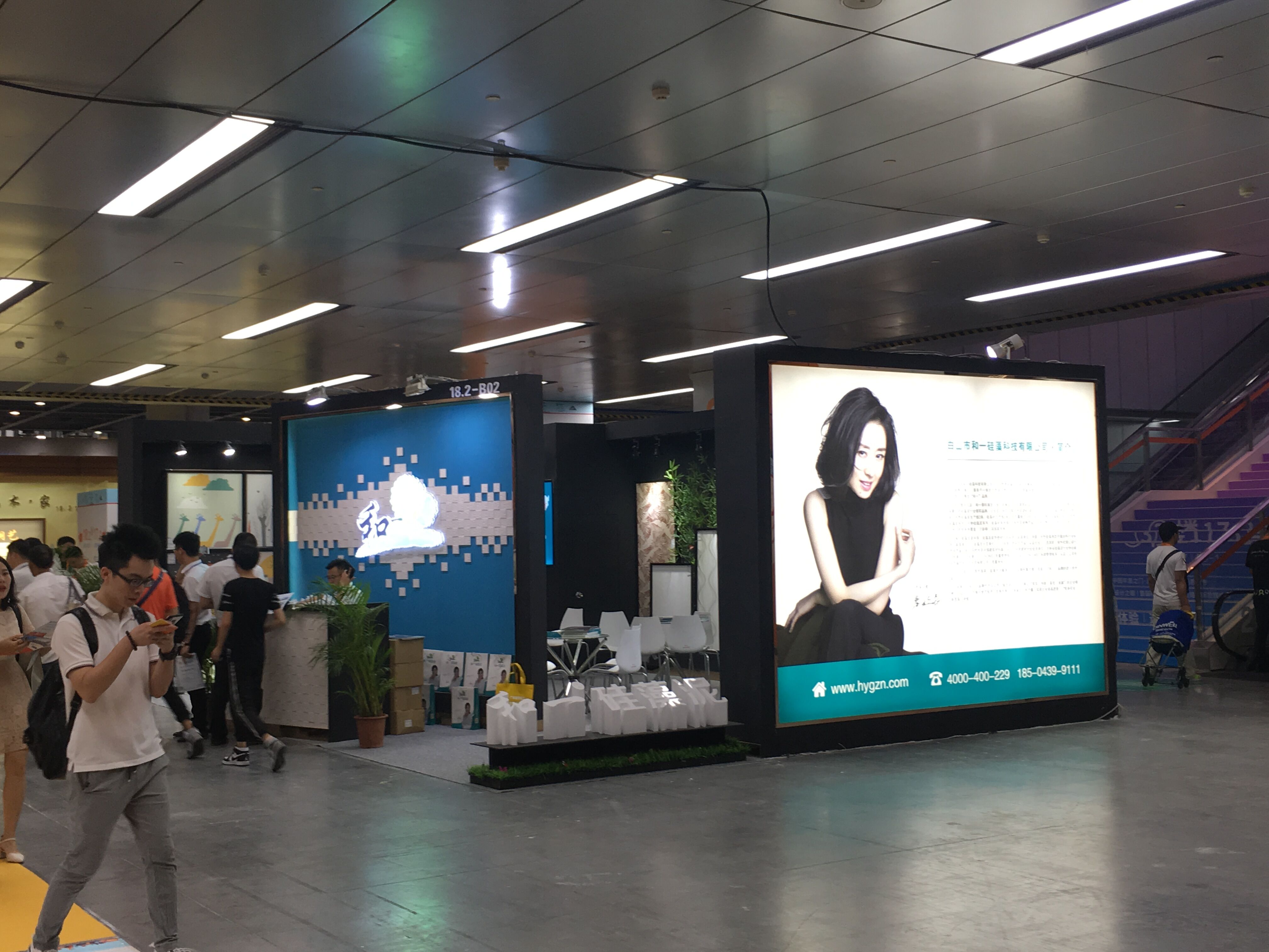 契合和一硅藻泥的品牌形象和產(chǎn)品特性,利用黑色突出產(chǎn)品,再搭配燈具燈光的效果,襯托出展位現(xiàn)代、突出一種現(xiàn)代、高端的時(shí)尚品味。