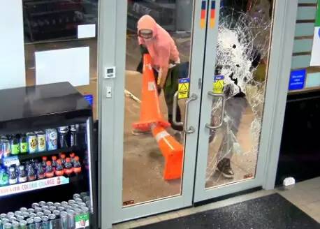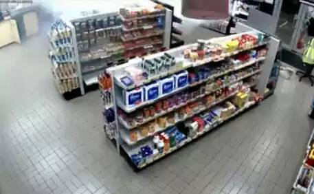 監(jiān)控錄像記錄了事發(fā)的整個(gè)過(guò)程:一開(kāi)始,兩個(gè)帶著作案工具的蒙面盜賊在用力敲擊加油站內(nèi)商店的玻璃門,動(dòng)作十分兇狠。就在他們將要從被砸破的門洞中鉆進(jìn)室內(nèi)時(shí),商店的一角開(kāi)始噴發(fā)白色煙霧(仔細(xì)看下圖左上角)。
