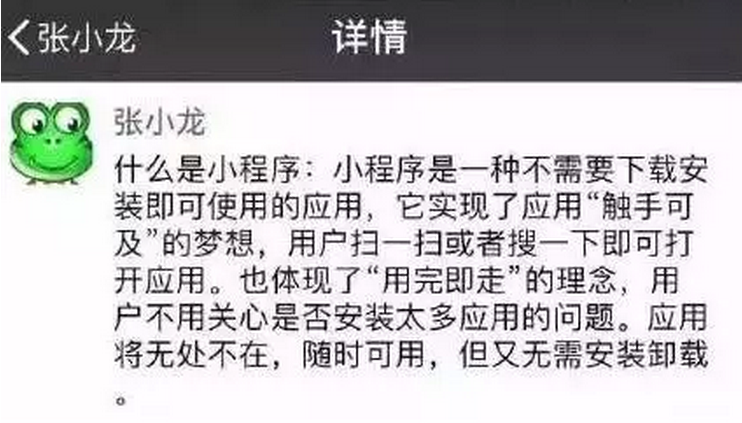 什么是微信小程序呢?根據(jù)張小龍的官方解釋,微信小程序,簡稱CX,是一種不需要下載安裝即可使用的應(yīng)用,它實(shí)現(xiàn)了應(yīng)用“觸手可及”的夢想,用戶掃一掃或搜一下即可打開應(yīng)用。用最簡明扼要、通俗易懂的關(guān)鍵詞概括就是:又小又快的應(yīng)用。體積小,不超過1M,打開快速,用完即走,來去自如,和進(jìn)入一個網(wǎng)站頁面差不多的感覺。