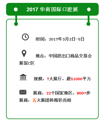 2017年3月2日-2017年3月5日,在中國進(jìn)出口商品交易會展館,即將舉辦第二十二屆華南國際口腔展覽會,屆時的廣州口腔展展會設(shè)計裝修將展現(xiàn)人們對口腔的重視,為期4天的展會將迎來全球100多個國家的五萬多名口腔醫(yī)療專業(yè)人士,為各位小伙伴們做指導(dǎo)。