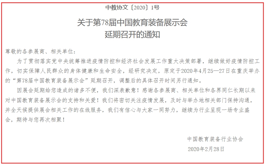 根據(jù)重慶教育展設(shè)計(jì)搭建公司領(lǐng)藝展覽了解到,為了貫徹落實(shí)黨中央統(tǒng)籌推進(jìn)疫情防控和經(jīng)濟(jì)社會(huì)發(fā)展工作重大決策部署,繼續(xù)做好疫情防控工作,切實(shí)保障人民群眾的身體健康和生命安全,經(jīng)研究決定,原定于2020年4月25—27日在重慶舉辦的“第78屆中國(guó)教育裝備展示會(huì)”延期召開,調(diào)整后的具體召開時(shí)間另行通知。如需重慶教育展設(shè)計(jì)請(qǐng)聯(lián)系領(lǐng)藝展覽,希望我們能在重慶教育展搭建上為您添磚加瓦,祝各位朋友收獲多多,滿載而歸!