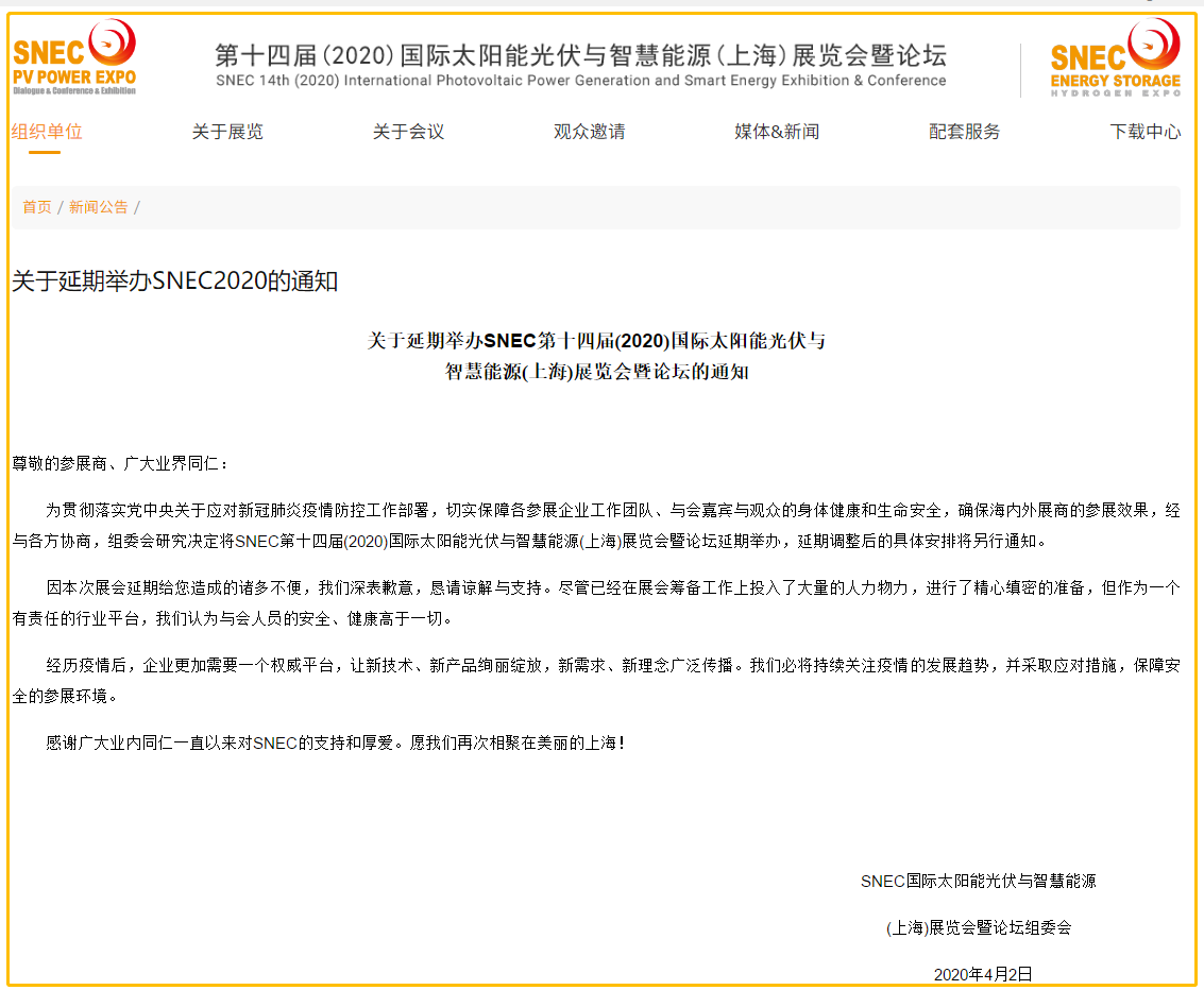 根據(jù)光伏展設(shè)計(jì)搭建公司領(lǐng)藝展覽了解到,為貫徹落實(shí)黨中央關(guān)于應(yīng)對(duì)新冠肺炎疫情防控工作部署,切實(shí)保障各參展企業(yè)工作團(tuán)隊(duì)、與會(huì)嘉賓與觀眾的身體健康和生命安全,確保海內(nèi)外展商的參展效果,經(jīng)與各方協(xié)商,組委會(huì)研究決定將SNEC第十四屆(2020)國(guó)際太陽能光伏與智慧能源(上海)展覽會(huì)暨論壇延期舉辦,延期調(diào)整后的具體安排將另行通知。如需光伏展設(shè)計(jì)請(qǐng)聯(lián)系領(lǐng)藝展覽,希望我們能在光伏展搭建上為您添磚加瓦,祝各位朋友收獲多多,滿載而歸!