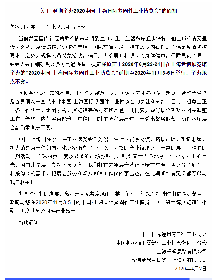 根據(jù)緊博會設(shè)計搭建公司領(lǐng)藝展覽了解到,受新冠肺炎疫情影響,原定于2020年6月22-24日在上海世博展覽館舉辦的“2020中國·上海國際緊固件工業(yè)博覽會”延期至2020年11月3-5日舉行,舉辦地點不變。如需緊博會設(shè)計請聯(lián)系領(lǐng)藝展覽,希望我們能在緊博會搭建上為您添磚加瓦,祝各位朋友收獲多多,滿載而歸!
