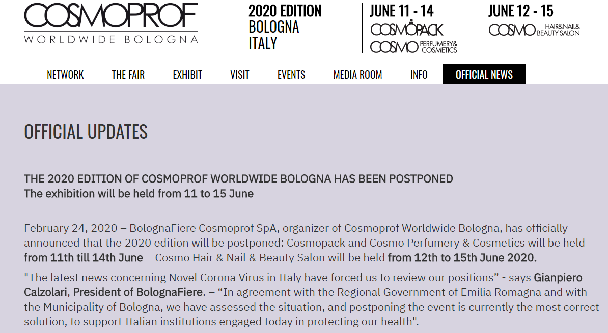 根據(jù)美博會(huì)設(shè)計(jì)搭建公司領(lǐng)藝展覽了解到,2020年2月24日 Cosmoprof Worldwide Bologna的組織者BolognaFiere Cosmoprof SpA正式宣布展會(huì)將推遲到2020年6月11日至15日舉行。如需美容展設(shè)計(jì)請(qǐng)聯(lián)系領(lǐng)藝展覽,希望我們能在美容展搭建上為您添磚加瓦,祝各位朋友收獲多多,滿載而歸!