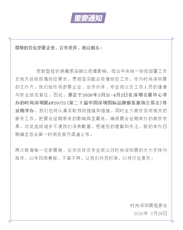 根據(jù)時(shí)尚深圳展設(shè)計(jì)搭建公司領(lǐng)藝展覽了解到,受新型冠狀病毒感染肺炎疫情影響,結(jié)合中央統(tǒng)一防控部署工作及地方政府疫情防控要求,貫徹落實(shí)配合疫情防控工作,作為時(shí)尚深圳展的主辦方,我們始終將參展企業(yè)、合作伙伴、專(zhuān)業(yè)觀眾及工作人員的健康與安全放在首位,因此,原定于2020年3月31-4月2日在深圳會(huì)展中心舉辦的時(shí)尚深圳展AW20/21(第二十屆中國(guó)深圳國(guó)際品牌服裝服飾交易會(huì))將延期舉辦,我們也將認(rèn)真采取預(yù)防措施和措施,同時(shí)全力做好各項(xiàng)相關(guān)的服務(wù)工作,把展會(huì)延期帶來(lái)的影響降至最低,確保展會(huì)延期舉辦的商貿(mào)效果。對(duì)此造成諸多不便我們深表歉意,感謝您的理解和關(guān)注,新的舉辦日期確定后會(huì)第一時(shí)間在官方渠道公布。如需時(shí)尚深圳展設(shè)計(jì)請(qǐng)聯(lián)系領(lǐng)藝展覽,希望我們能在時(shí)尚深圳展搭建上為您添磚加瓦,祝各位朋友收獲多多,滿載而歸!