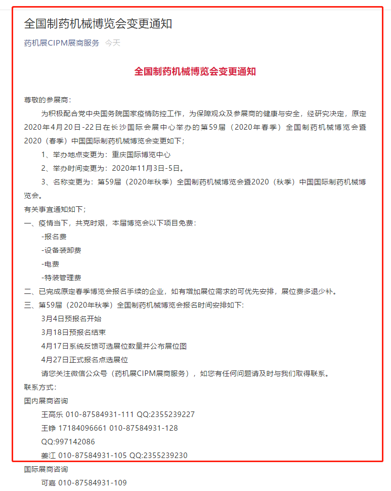 根據(jù)藥機展設(shè)計搭建公司領(lǐng)藝展覽了解到,為積極配合黨中央國務(wù)院國家疫情防控工作,為保障觀眾及參展商的健康與安全,經(jīng)研究決定,原定2020年4月20日-22日在長沙國際會展中心舉辦的第59屆(2020年春季)全國制藥機械博覽會暨2020(春季)中國國際制藥機械博覽會變更。如需藥機展設(shè)計請聯(lián)系領(lǐng)藝展覽,希望我們能在藥機展搭建上為您添磚加瓦,祝各位朋友收獲多多,滿載而歸!