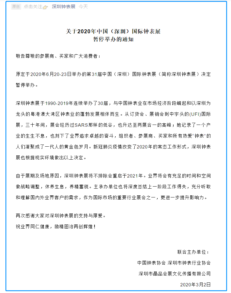 根據(jù)深圳展臺(tái)設(shè)計(jì)搭建公司領(lǐng)藝展覽了解到,原定于2020年6月20-23日舉辦的第31屆中國(guó)(深圳)國(guó)際鐘表展(簡(jiǎn)稱深圳鐘表展)決定暫停舉辦。如需深圳展臺(tái)設(shè)計(jì)請(qǐng)聯(lián)系領(lǐng)藝展覽,希望我們能在深圳展會(huì)搭建上為您添磚加瓦,祝各位朋友收獲多多,滿載而歸!