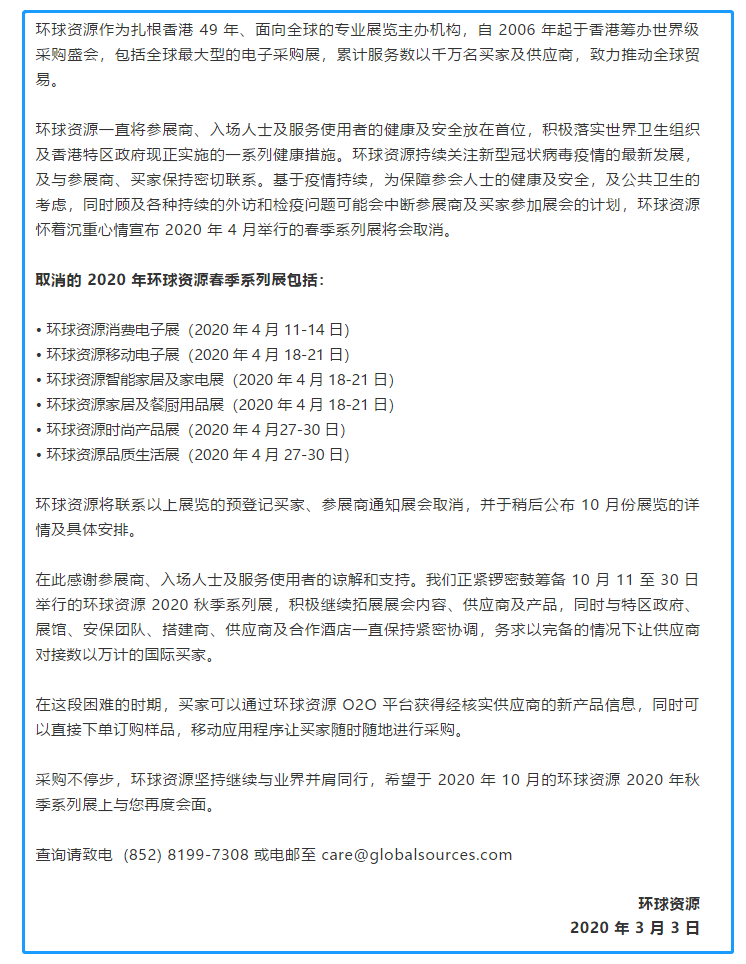 根據(jù)餐廚用品展設(shè)計搭建公司領(lǐng)藝展覽了解到,環(huán)球資源作為扎根香港 49 年、面向全球的專業(yè)展覽主辦機構(gòu),自 2006 年起于香港籌辦世界級采購盛會,包括全球最大型的電子采購展,累計服務(wù)數(shù)以千萬名買家及供應(yīng)商,致力推動全球貿(mào)易?;谝咔槌掷m(xù),為保障參會人士的健康及安全,及公共衛(wèi)生的考慮,同時顧及各種持續(xù)的外訪和檢疫問題可能會中斷參展商及買家參加展會的計劃,環(huán)球資源懷著沉重心情宣布 2020 年 4 月舉行的春季系列展將會取消。原計劃環(huán)球資源家居及餐廚用品展展會時間是2020 年 4 月 18-21 日。環(huán)球資源將聯(lián)系展覽的預(yù)登記買家、參展商通知展會取消,并于稍后公布 10 月份展覽的詳情及具體安排。如需餐廚用品展展臺設(shè)計請聯(lián)系領(lǐng)藝展覽,希望我們能在餐廚用品展展臺搭建上為您添磚加瓦,祝各位朋友收獲多多,滿載而歸!