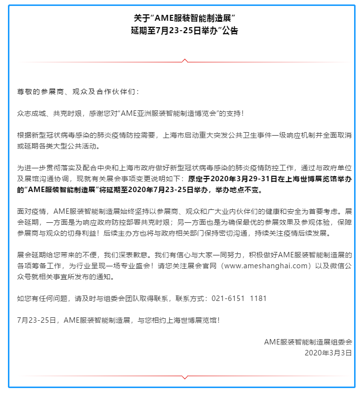 根據(jù)上海服裝展設(shè)計搭建公司領(lǐng)藝展覽了解到,原定于2020年3月29-31日在上海世博展覽館舉辦的“AME服裝智能制造展”將延期至2020年7月23-25日舉辦,舉辦地點不變。如需上海展臺設(shè)計請聯(lián)系領(lǐng)藝展覽,希望我們能在上海展臺搭建上為您添磚加瓦,祝各位朋友收獲多多,滿載而歸!