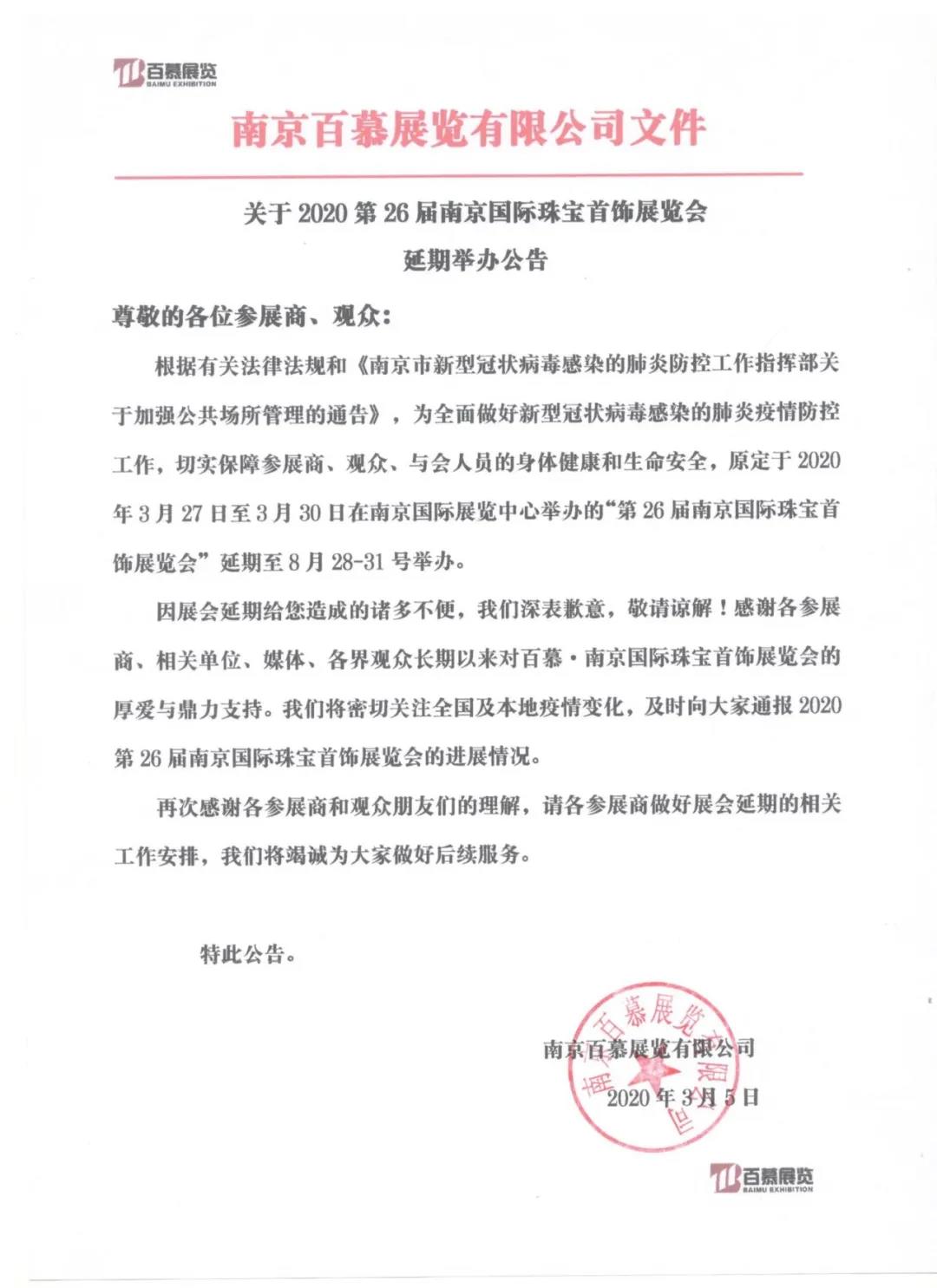 根據(jù)珠寶展設(shè)計(jì)搭建公司領(lǐng)藝展覽了解到,原定于2020年3月27-30日在南京國(guó)際展覽中心舉辦的第26屆南京國(guó)際珠寶首飾展覽會(huì)延期至8月28日-31日舉辦。如需珠寶展展臺(tái)設(shè)計(jì)請(qǐng)聯(lián)系領(lǐng)藝展覽,希望我們能在珠寶展展臺(tái)搭建上為您添磚加瓦,祝各位朋友收獲多多,滿載而歸!
