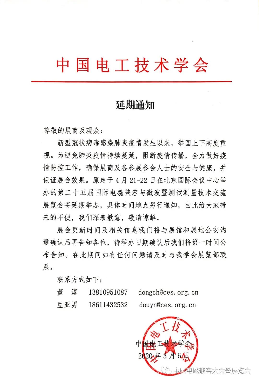 根據(jù)電磁展展臺設(shè)計搭建公司領(lǐng)藝展覽了解到,原定于2020年4月21-22日在北京國際會議中心舉辦的第二十五屆國際電磁兼容與微波暨測試測量技術(shù)交流展覽會將延期舉辦。如需電磁展展臺設(shè)計請聯(lián)系領(lǐng)藝展覽,希望我們能在電磁展展臺搭建上為您添磚加瓦,祝各位朋友收獲多多,滿載而歸!