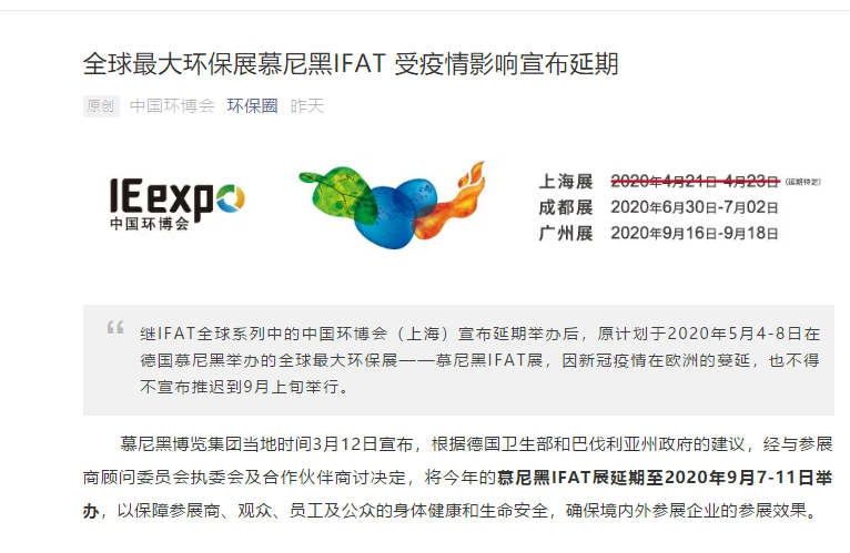 根據(jù)環(huán)保展設(shè)計(jì)搭建公司領(lǐng)藝展覽了解到,慕尼黑博覽集團(tuán)當(dāng)?shù)貢r(shí)間3月12日宣布,根據(jù)德國(guó)衛(wèi)生部和巴伐利亞州政府的建議,經(jīng)與參展商顧問委員會(huì)執(zhí)委會(huì)及合作伙伴商討決定,將今年的慕尼黑IFAT展延期至2020年9月7-11日舉辦,以保障參展商、觀眾、員工及公眾的身體健康和生命安全,確保境內(nèi)外參展企業(yè)的參展效果。如需環(huán)保展設(shè)計(jì)請(qǐng)聯(lián)系領(lǐng)藝展覽,希望我們能在環(huán)保展搭建上為您添磚加瓦,祝各位朋友收獲多多,滿載而歸!