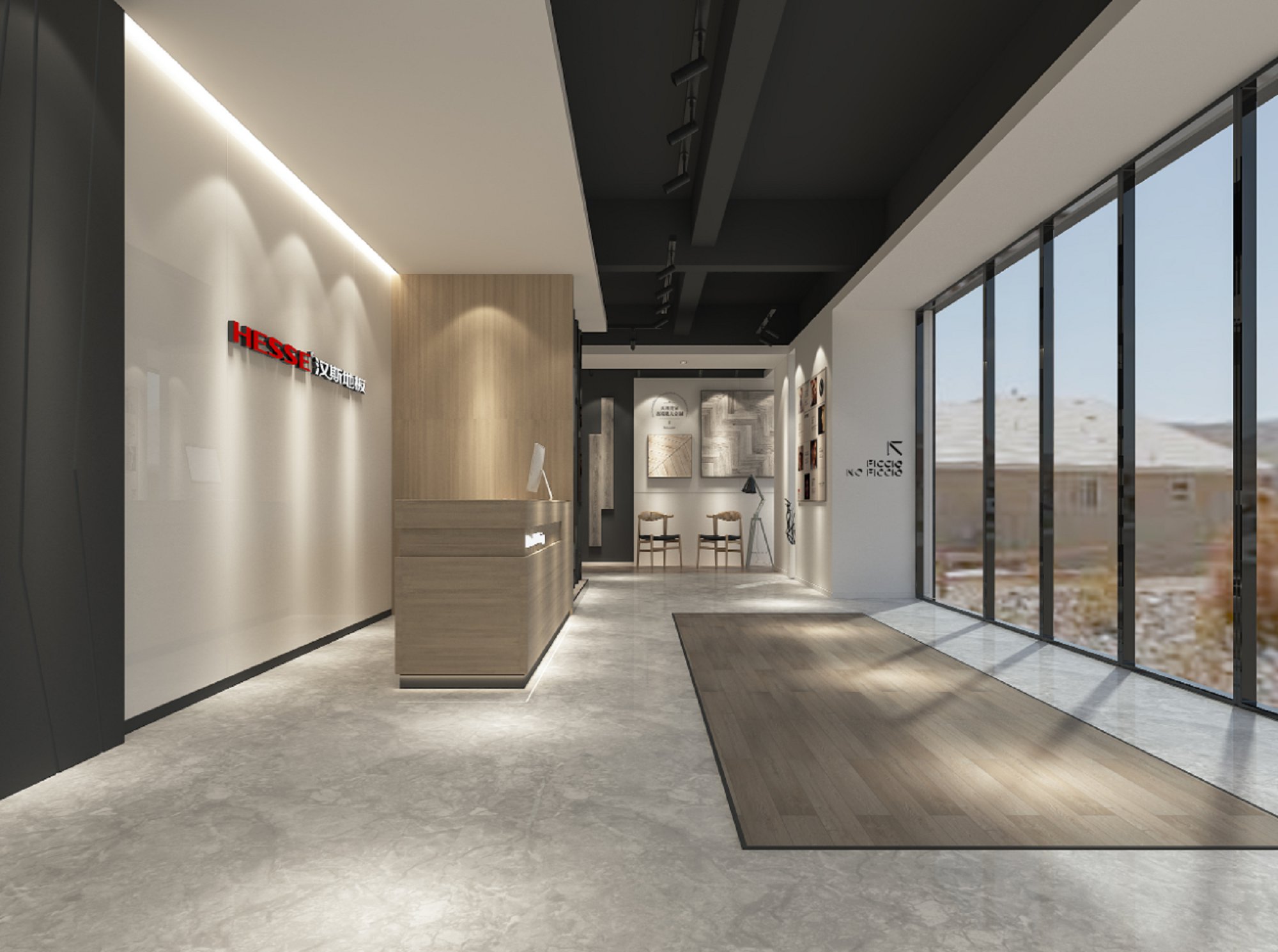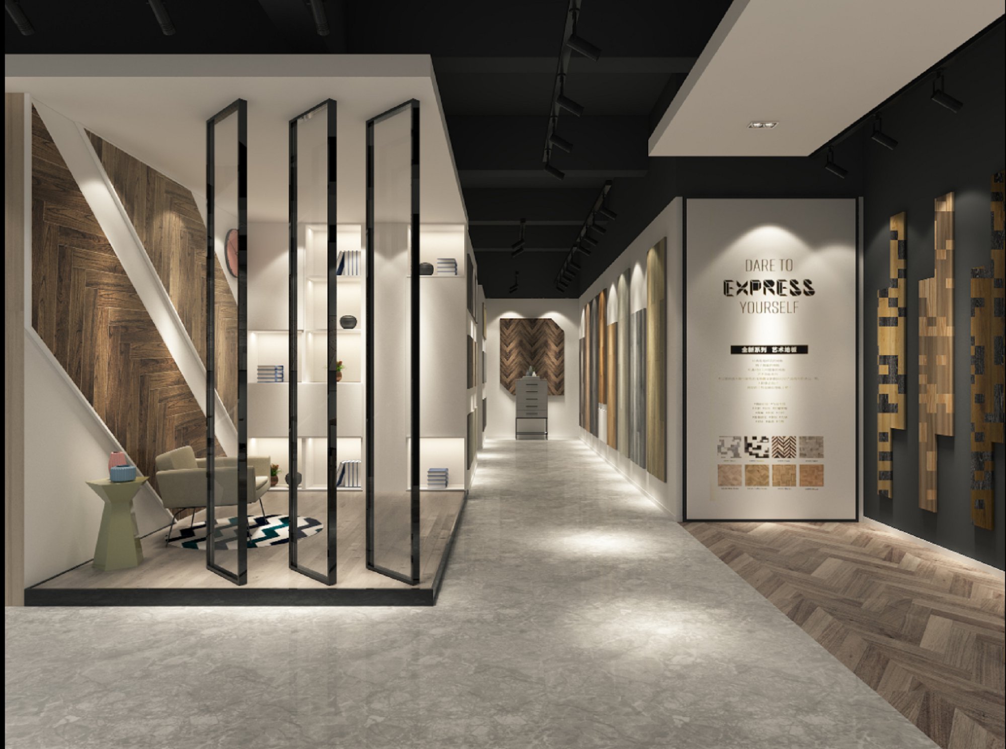 契合漢斯地板的品牌形象和產(chǎn)品特性,采用開放式結(jié)構(gòu)進行合理的分區(qū),再搭配燈具燈光的效果,襯托出展廳大氣、豪華的氛圍,突出一種簡約、時尚的品味。