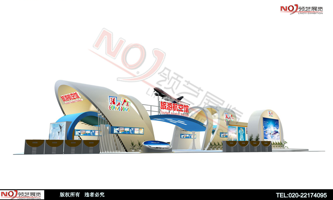 由航空飛機(jī)模型為創(chuàng)意主體,結(jié)構(gòu)采用弧形結(jié)構(gòu),展現(xiàn)海上絲綢之路國家的航空鏈接再搭配采用聲光電,襯托出展位大氣、豪華的氛圍,突出一種簡約、時尚現(xiàn)代感十足的國際化效果。